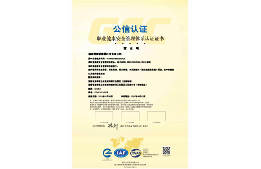 ISO45001职业健康安全管理体系证书 2025-01-15 常青新能源 兹证明:福建常青新能源科技有限公司,统一社会信用代码:91350823MA325D2F2G,其职业健康安全管理体系符合:GB/T45001-2020/ISO45001:2018标准,该职业健康安全管理体系适用于:废旧锂离子电池回收、再生利用、梯次利用;三元前驱体(镍钴锰氢氧化物)研发、生产和服务以及相关管理活动