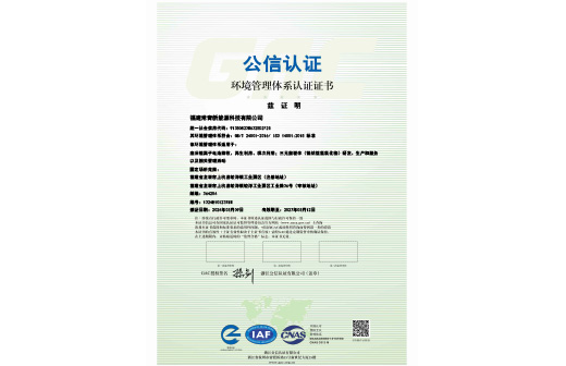 ISO 14001环境管理体系认证证书 2025-03-23 常青新能源 兹证明:福建常青新能源科技有限公司(统一社会信用代码:91350823MA325D2F2G),其环境管理体系符合:GB/T24001-2016/18014001:2015标准。该环境管理体系适用于: 废旧锂离子电池回收、再生利用、梯次利用;三元前驱体(钴锰氢氧化物)研发、生产和服务以及相关管理活动