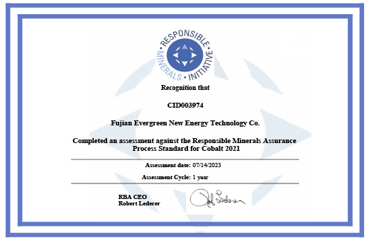 RMAP Recognition Cert 供应链尽责体系证书 2025-04-02 常青新能源 Recognition that:CID003974,Fujian Evergreen New Energy Technology Co. Completed an assessment against the Responsible Minerals Assurance Process Standard for Cobalt 2021. Assessment date:07/14/2023 Assessment Cycle: l year